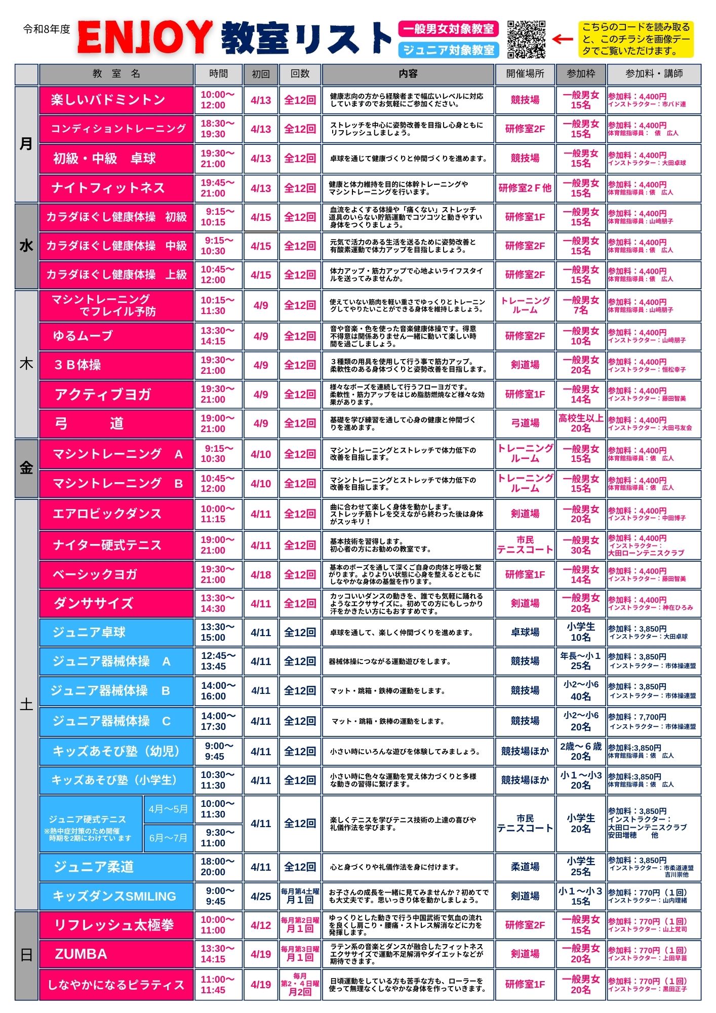 2026.3.2 大田総合体育館春のスポーツ教室「ENJOY」を開催いたします。皆様のご参加お待ちしております。詳しくは要項及び教室一覧をご覧ください。