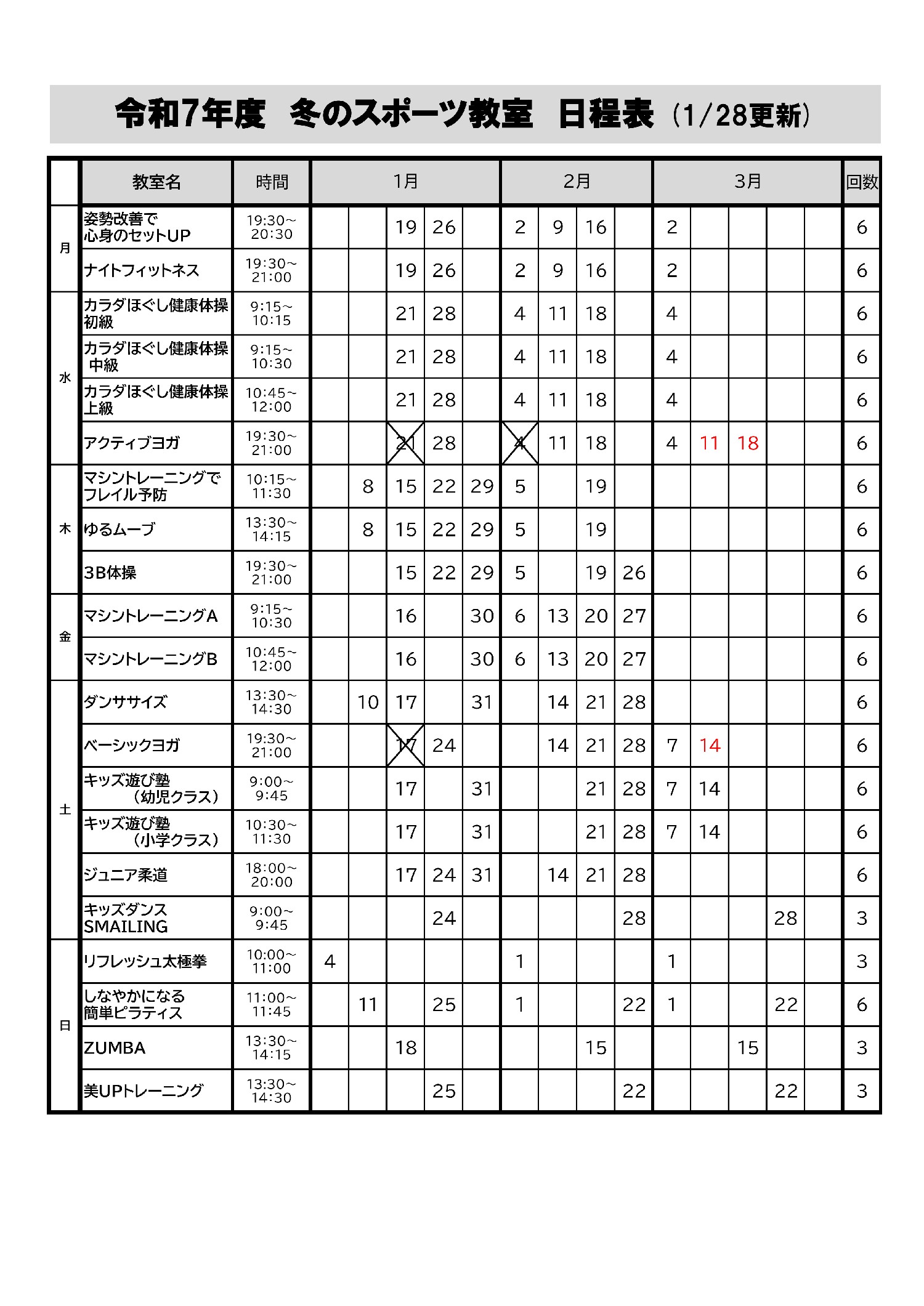 2026.1.22 令和7年度大田総合体育館冬のスポーツ教室「ENJOY」の日程を作成しました。ダウンロードはこちらをクリックしてください。