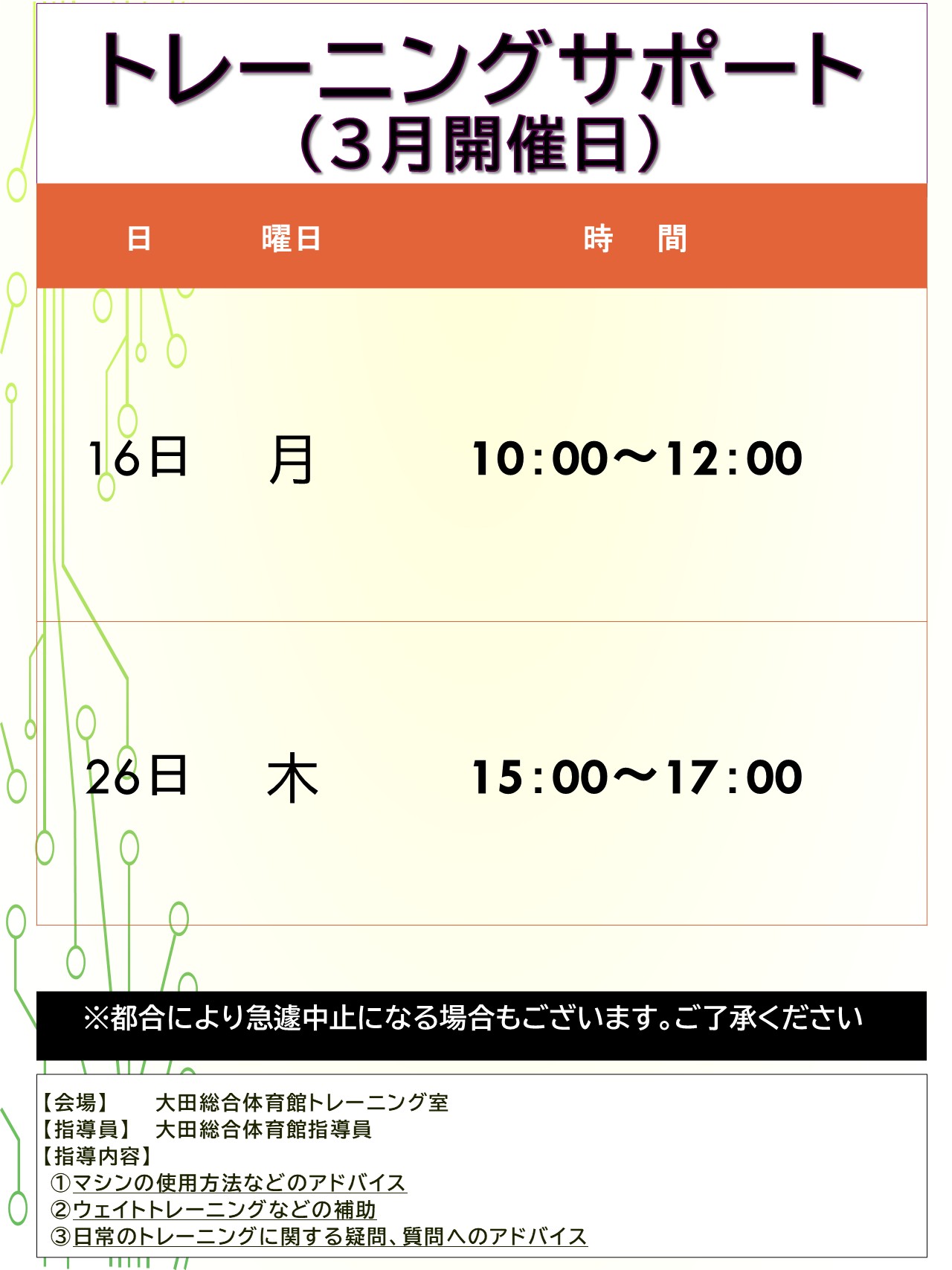 トレーニングサポート事業を下記のとおり開催いたします。皆様のご利用お待ちしております。