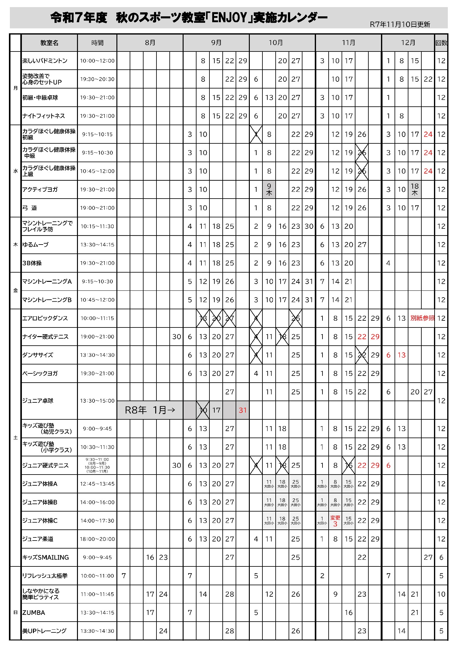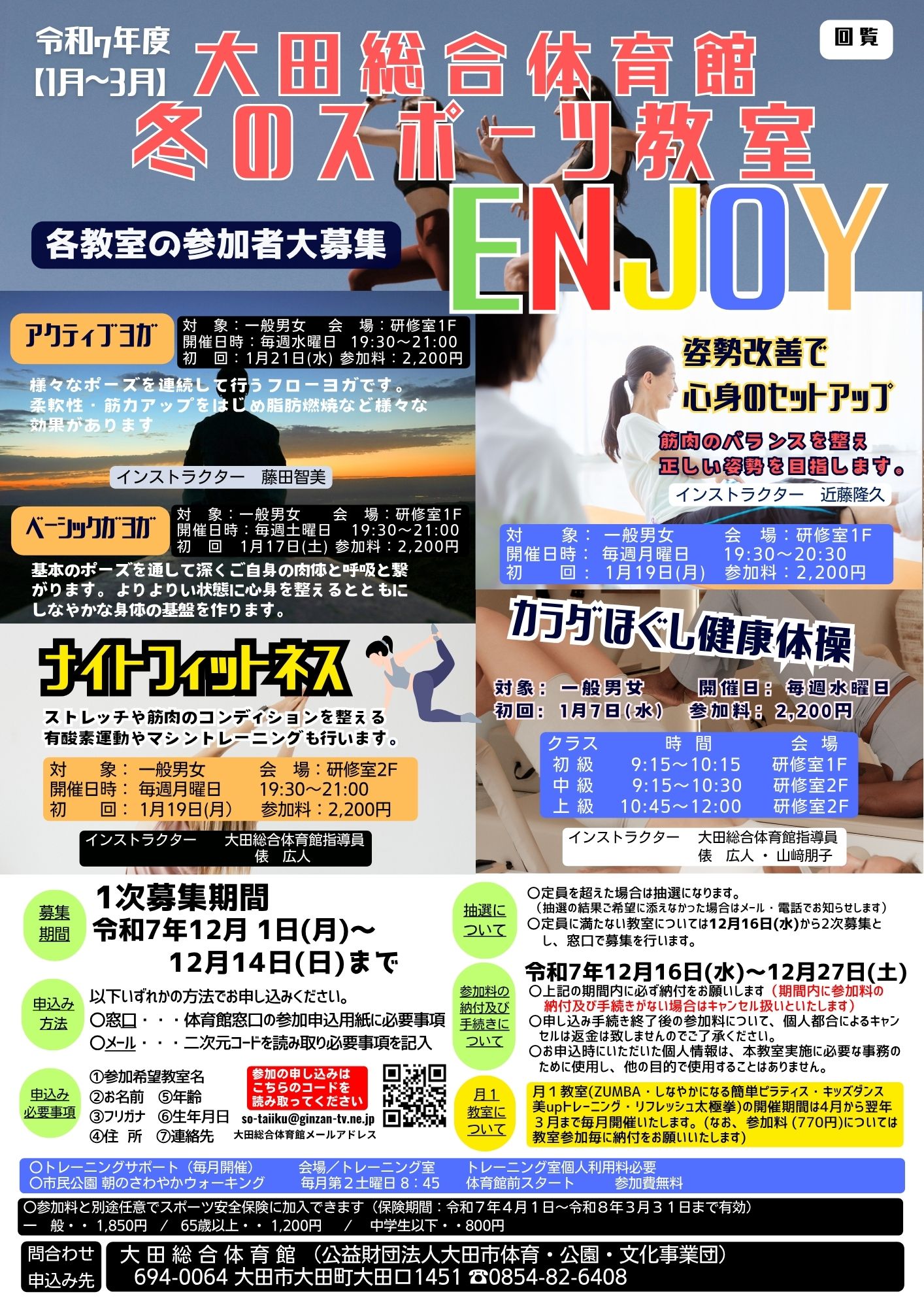 2025.12.1 令和7年度大田総合体育館冬のスポーツ教室「ENJOY」を実施します。詳しくは要項と教室一覧をご覧ください。